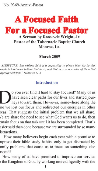 We should constantly pray that our pastors remain focused on the vision that God has given them for the local congregation. To carry out God's will successfully requires a focused faith from a focused pastor; with that all things are possible. INCLUDES:Word and text file, PDF, Powerpoint slides, and Bulletin insert art.